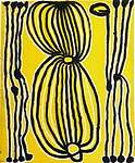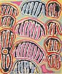 This Jukurrpa comes from Mina Mina far to the west of Yuendumu. In the Dreaming women danced at Mina Mina and digging sticks rose up out of the ground. The women collected these up and travelled on, dancing and creating many places. The central motif of this work is Ngalyipi, or snake vine, a rope-like creeper used as a ceremonial wrap. The circles represent Jintiparnta, native truffle, which the women gathered for sustenance on their long journey which eventually took them beyond Warlpiri country. |