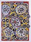 The country associated with this Ngapa Jukurrpa (water Dreaming) is Mikanji, a watercourse that is usually dry, west of Yuendumu. In this creek bed there are ‘mulju’ (soakages). The Dreaming travelled from Puyurru, northwest of Yuendumu to a ‘mulju’ in the Mikanji creek. By the side of the soakages two old blind women were sitting. A rain ancestor travelled to Mikanji from Puyurru and unleashed a huge storm. As the two women strained their eyes to see the sky, tears formed in their eyes, creating the rain. Their spirits can still be seen at Mikanji in the form of two ‘ngapiri’ (river red gums) growing near the soakage. |