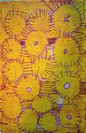 The Jukurrpa story associated with Yarlukari (to the west of Yuendumu) tells of the emus who came from the east and travelled through Yarlukari to Mikanji. They were travelling through dry land until they reached Yarlukari. Darby has painted the emus dancing around the waterholes. The other concentric circles represent the many waterholes in the area. The Jampijinpa and Jangala Emu (Yankirri) Dreaming is a men’s story and much of it is private. Darby almost took two years to complete this complex screenprint which involved 12 separate sheets of acetate. |