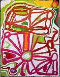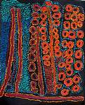 Tjaruwa has painted her homeland of Yampil, an area in northern Spinifex. This is sandhill country, with Spinifex and Mulga trees and very sparse water deposits usually in the form of rockholes which are quite small or soak water which you have to dig for. To survive in this western desert area it is essential to know where to find the water and this knowledge has been passed down over thousands of years from generation to generation. Tjaruwa has painted the rockholes of Tjiru, Pakutjatjara, Waltjapi, Kamanti, Waltjipi, Pur Pur,Pulitja, Kapi Wiyatjara, Pulitja and Tjiwara. The two half circles represent the camps of the Wati Kutjara story that is present in this area. |