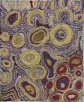 Kathleen was born in the Great Victoria Desert where she lived with her immediate family until she was a young woman. In this painting Kathleen combines the two areas of Tjuntun and Tjintirkara. The large white roundels represent the large rockhole of Tjintirkara which is situated on the border of WA and SA. Tjintirkara is physically a very large and open rockhole surrounded by dozens of small holes in the rockbed. In Spinifex lore these physical features hold the story of Tjintirtjintir the Willy Wagtail woman. Tjintirtjintir was camped alone at Tjintirkara when a violent storm swept through the area. Awoken from her sleep she dashed for another location and was hit and killed by huge hailstones. These stones left the unusual impressions in the rock. Tjintirtjintir is an important women's site widely known across the Western Desert. |