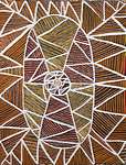 The Kulama is an important ceremony of the Tiwi people; the dancers and singers create a circle and prepare the poisonous yam for eating, as indicated by the circles in the painting. The Kulama ceremony was given to the Tiwi people by the Nyingawi, who are little spirit people (as depicted in Tiwi mythology). It is a celebration of life and food, occurring at the end of the wet season. The Tiwi know when to perform Kulama when the last full moon of the wet season has a yellow halo surrounding it, which tells them that Japarra (the moon man) is ready for it to begin. |